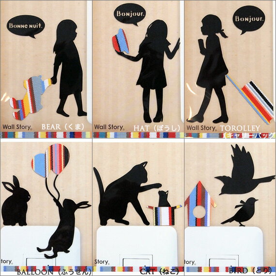 CAT/ねこ ステッカー(大きなねこ、小さなねこ、帽子 / サイズ:約6cm×7cm) BIRD/とり ステッカー(鳥かご、鳥1、鳥2 / サイズ:約7.5cm×7.5cm) BALLOON/ふうせん ステッカー(うさぎ1、うさぎ2、ふうせん / サイズ:約10cm×7.5cm) TOROLLEY/キャリーバッグ ステッカー(女の子、キャリーバッグ、Bonjour / サイズ:約8.5cm×7cm) HAT/帽子 ステッカー(女の子、帽子、Bonjour / サイズ:約5.5cm×9.5cm) BEAR/くま ステッカー(女の子、くま、Bonne Nuit/ サイズ:約6.5cm×8.5cm) WALL STICKER × Les Toiles Du Soleil [ レトワール デュ ソレイユ ]WALL STICKER / ウォールステッカー今、話題のwallstickerとレ・トワール・デュ・ソレイユのコラボレート商品電気のスイッチまわり、棚の上、トイレの壁など毎日何気なく見ている場所にストーリーを生み出すことができるウォールステッカーです。